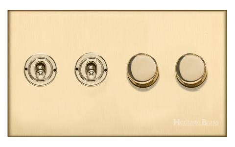 Winchester Range Satin Brass | 4G Mixed Toggle Dimmer Switch 2xToggle 2xTED